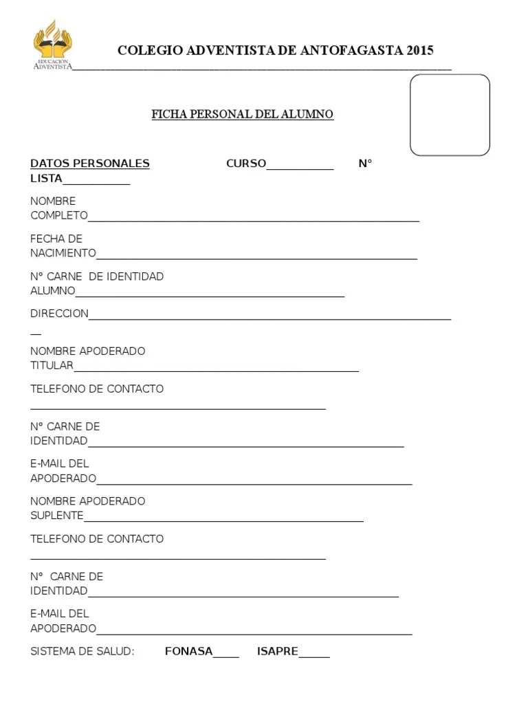 La ficha personal del estudiante, en la cual podrán registrar todos los datos del alumno y también los datos del tutor y el padre y madre de familia . La ficha personal del estudiante, en la cual podrán registrar todos los datos del. La finalidad de esta ficha personal es la recogida de información del alumno/a tanto en aspectos personales (médicos y familiares).